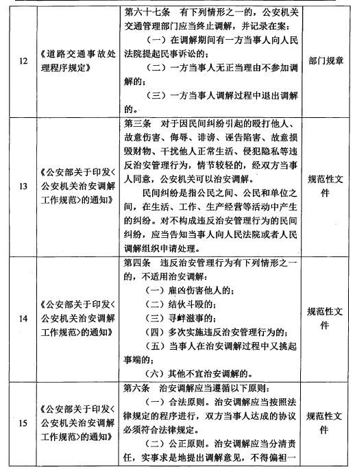 在第一屆全國人大常務委員會通過的《中華人民共和國治安管理處罰條例》中,就對派出所治安調(diào)解做出了相應的規(guī)定。2006年3月1日起實施的《治安管理處罰法》對派出所治安調(diào)解又做了新的解釋,進一步明確賦予了派出所以治安案件調(diào)解處理權(quán),派出所成為治安調(diào)解的主持者。歸納起來看,派出所治安調(diào)解所依據(jù)的法律法規(guī)主要包括:《治安管理處罰法》、《人民警察法》、《公安機關(guān)治安調(diào)解工作規(guī)范》、《公安機關(guān)辦理行政案件程序規(guī)定》、《關(guān)于公安機關(guān)貫徹實施(中華人民共和國行政訴訟法)若干問題的通知》以及《道路交通安全法》和《道路交通事故處理程序規(guī)定》等法律性文件。這些法律性文件中直接規(guī)定或間接涉及到派出所調(diào)解的有30多個條款。通過這些法律法規(guī),有關(guān)派出所調(diào)解的法律規(guī)范得到了繼承和發(fā)展。?這些條款從調(diào)解的原則、調(diào)解適用的范圍和情形、終止調(diào)解的情形、不適用調(diào)解的事項和情形、參與調(diào)解的當事人、調(diào)解程序、調(diào)解案件的辦案期限、調(diào)解次數(shù)、調(diào)解書內(nèi)容及制作要素、調(diào)解引起的法律后果以及調(diào)解不成的處理方式等多方面對派出所調(diào)解工作進行了比較明確的規(guī)范(具體見下表),為派出所調(diào)解工作提供了比較具體的法律依據(jù)。