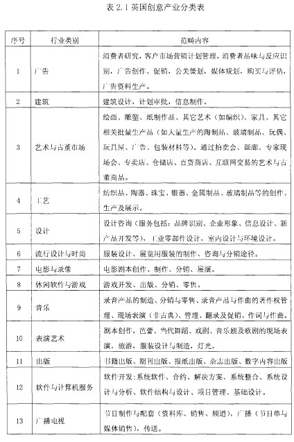目前,國內外對文化創意產業的稱謂不盡相同,包含的行業類別也頗有不同,根據文化創意產業的本質特點和屬性分析,這些概念和分類既有屬于文化創意產業的內容,也有不在其范疇的方面,但均可為界定文化創意產業的概念和分類提供參考。英國采用“創意產業”的概念,將其界定為“源自個人創意、技巧及刁`華,通過知識產權的開發及應用,具有創造財富和就業潛力的行業”〔詳見表2.1)。