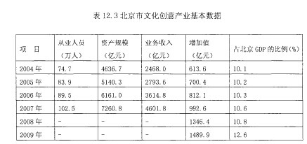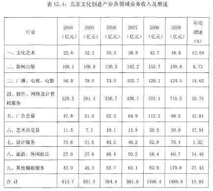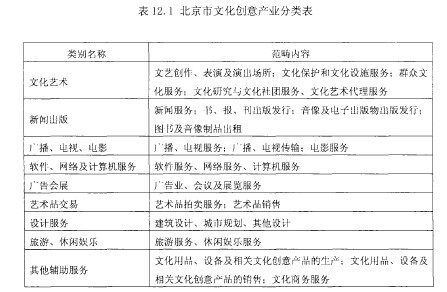 2006年,北京市公布了《北京市文化創意產業分類標準》,將文化創意產業定義為以創作、創造、創新為根本手段,以文化內容和創意成果為核心價值,以知識產權實現或消費為交易特征,為社會公眾提供文化體驗的具有內在聯系的行業集群,具體分為文化藝術,新聞出版,廣播、電視、電影,軟件、網絡及計算機服務,廣告會展,藝術品交易,設計服務,旅游、休閑娛樂和其他輔助服務9大類(如表12.1)。
