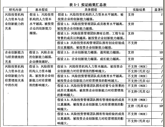 第四章實證研究結果與分析。本章首先對實驗變量進行描述性統(tǒng)計,初步了解實驗數據。接著對實驗結果進行了全面的分析,發(fā)現(xiàn)風險投資機構管理團隊人力資本影響企業(yè)的創(chuàng)新能力,企業(yè)創(chuàng)新能力的增值來源于風險投資機構提供的專業(yè)咨詢與建議。同時,企業(yè)創(chuàng)新能力的提升帶動了盈利能力和成長能力的提升,這部分的增值主要來自企業(yè)自身經營管理,風險投資機構的作用不明顯。