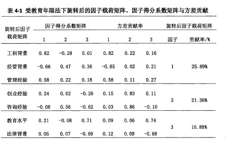 人力資本的研究經過多年的發(fā)展,其衡量體系相對成熟。目前的研宄表明,年齡、教育水平、專業(yè)背景、從業(yè)經驗等人力資本因素均可影響高管團隊的判斷決策,從而影響決策結果。本文將從教育水平、專業(yè)背景、從業(yè)經驗三個維度描述風險投資機構管理團隊人力資本情況,運用因子分析法建立人力資本指數(CIR)。其中,教育水平采用常用的受教育年限法和賦值法。根據風險投資行業(yè)的工作特性及所涉及知識領域,專業(yè)背景以管理團隊中擁有經管、理工和法律教育背景成員比例反映,從業(yè)經驗以管理團隊中擁有創(chuàng)業(yè)、管理和咨詢經驗的成員比例反映。