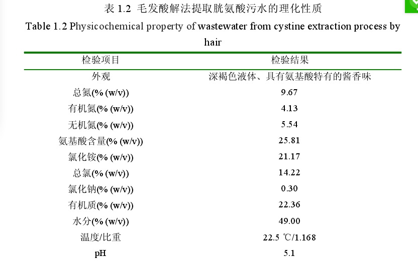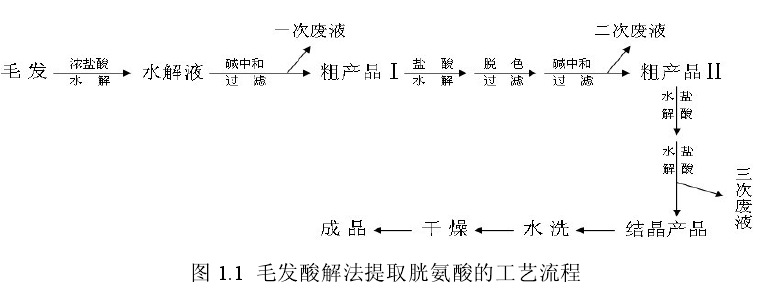 氨基酸工業污水有機物含量高、氨氮含量高、鹽分高、酸性強,處理難度較大[5-7]。目前,生產氨基酸的企業大部分用強酸酸解人或動物的毛發,生產氨基酸單體工藝流程見圖 1.1。呂墩氨基酸廠用毛發酸解法提取氨基酸的污水成分和理化性質參見表 1.1、表 1.2。