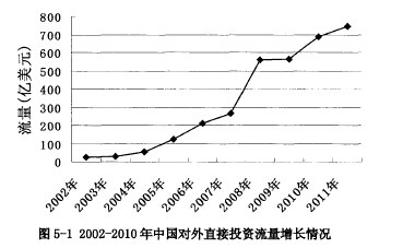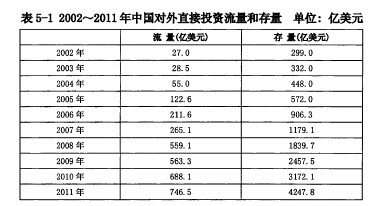 2011年,中國對外直接投資流量746.5億美元,較上年增長8.5%,其中:新增股本投資313.8億美元,占42%;當期利潤再投資244.6億美元,占32.8%。2011年末,中國對外投資存量達到4247億美元。表5-1及圖5-1清晰反映出近十年來中國對外直接投資的規模以及增長速度。