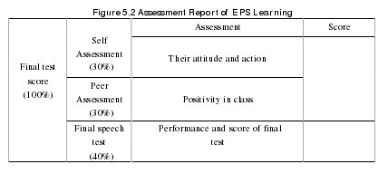 Formative assessment attaches more importance to learners’ needs, study process, expectedgoals and students’ initiative in learning. Feedback and reflection in formative assessment are usefulto collect information to guide teaching and learning. According to the literature review and thestudy, it seems obvious that formative assessment has a positive effect on students’ EPS learning.Effective implementation of formative assessment can promote students’ learning abilitysignificantly.In the study, the teacher adopted formative assessment and summative assessment in theexperimental class and control class and examined carefully students’ total score achieved in twoformal presentation (comprehensive EPS skill) and module score ( comprehensive language abilityand presentation skill).