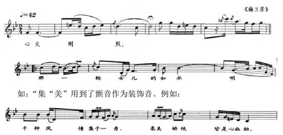 在戲曲演唱里有諸多技巧,如“墊音”“抹音”“顫音”“哭情”等等,《梅蘭芳》這首聲樂作品中前部分運(yùn)用到了“顫音”和“倚音。顫音,在戲曲(花鼓戲、川劇、京劇等等)里是一種潤腔的技巧以及一種經(jīng)常手段,對詮釋作品的風(fēng)格性起到關(guān)鍵性的作用,也是演唱者綜合藝術(shù)素質(zhì)以及二度創(chuàng)作能力的體現(xiàn)。“烈”“輪”都運(yùn)用小到了二度和小三度的“倚音”。例如:3